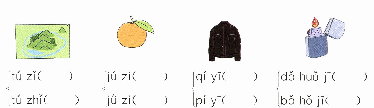 tú zhǐ(√) jú zi(√) pí yī(√) dǎ huǒ jī(√) 解析:这道题考查借助图片判断音节词的正误。第一幅图是图纸,正确的音节词是“tú zhǐ”;第二幅图是橘子,正确的音节词是“jú zi”;第三幅图是皮衣,正确的音节词是“pí yī”;第四幅图是打火机,正确的音节词是“dǎ huǒ jī”。
