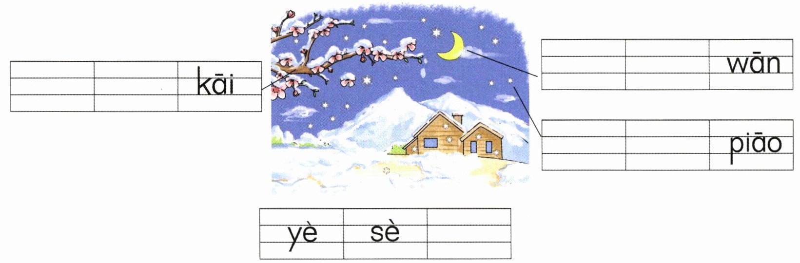 示例:méi huā yuè ér xuě huā měi 解析:这道题考查借助图片补充音节词的能力。由图片可知,下雪的夜晚,雪花飘飘,梅花开放,月儿弯弯,夜色美。据此补充音节词即可。