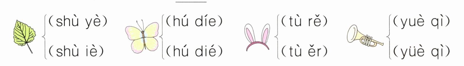 1. x üě què 解析:这道题考查借助图片拼写音节的能力。第一幅图是雪花,第二幅图是麻雀,注意“xuě”的韵母是“üe”,不要漏掉“ü”上的两点,据此补充音节即可。 2. shù yè hú dié tù ěr yuè qì 解析:这道题考查借助图片判断拼音正误的能力。第一幅图是树叶,正确的拼音写法是“shù yè”;第二幅图是蝴蝶,正确的拼音写法是“hú dié”;第三幅图是兔耳,正确的拼音写法是“tù ěr”;第四幅图是乐器,正确的拼音写法是“yuè qì”。