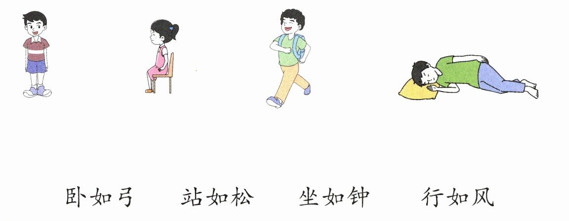 解析:这道题考查对课文内容的理解。“卧如弓”的意思是睡觉时身体侧卧,弯成“弓”形,全身放松,第四幅图的小男孩睡觉时的姿态像一张弓;“站如松”的意思是站立时要像松树一样挺拔,第一幅图的小男孩站得笔直;“坐如钟”的意思是坐着时要像钟一样端正,第二幅图的小女孩坐姿端正;“行如风”的意思是行走要像风那样快而有力,第三幅图的小男孩在快步行走。答题时先弄懂意思,再将图片与对应的文字连接起来即可。