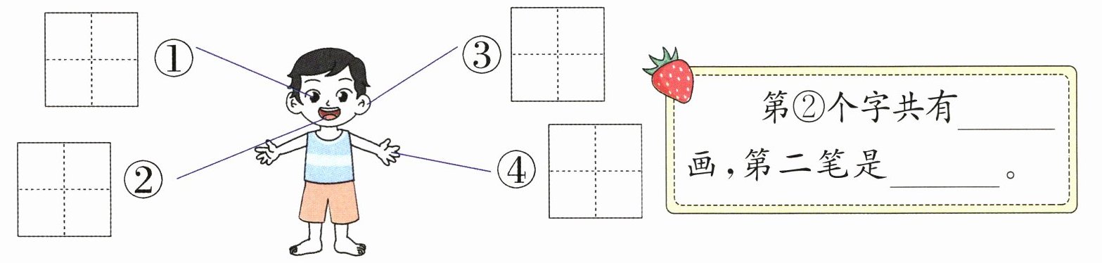 解析:这道题考查本课会写字的书写和笔画、笔顺。答题时先看图,了解图片内容,然后在田字格中写出线条连接的人体部位表示的汉字。写字时要注意笔顺,第②个字是“口”,要先写竖,再写横折,最后写横,由此可知“口”共有3画,第二笔是“𠃌”。