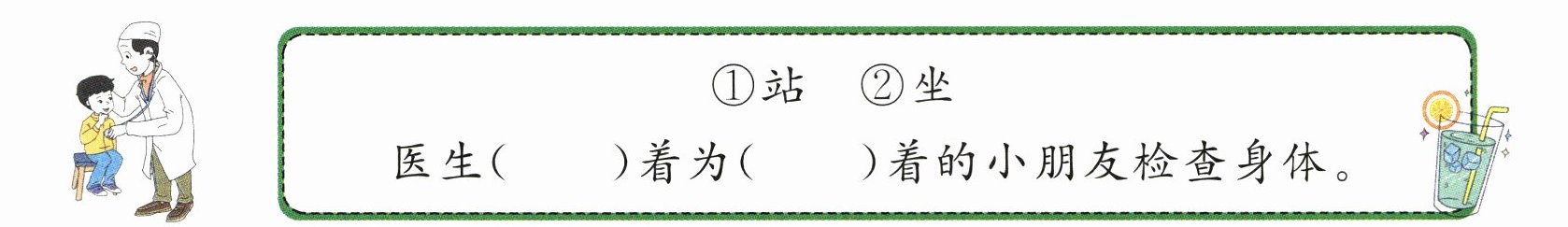 解析:这道题考查会认字。根据图片可知医生是站着的,小朋友是坐着的,所以答案依次为①②。