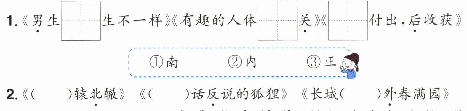一【趣味名字】节目单上的故事名字真有趣,都含有一对反义词,请你填一填,并选一选(填序号)。