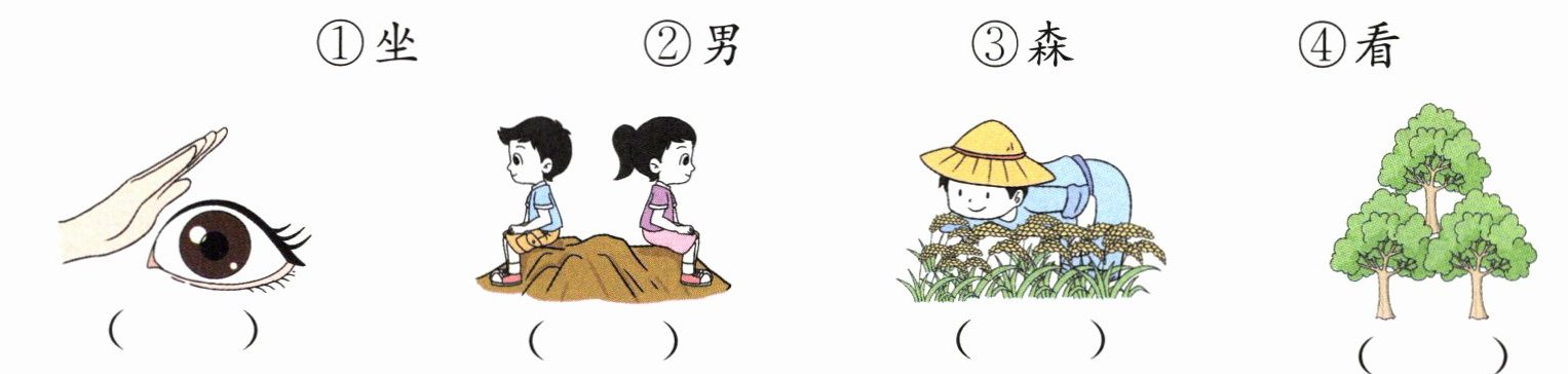 解析:这道题考查看图猜字。第一幅图画的是有一只手在眼睛上方,表示远望,应该是“看”。第二幅图画的是两个小孩坐在土堆上面,应该是“坐”。第三幅图画的是一个人在田里出力干活,应该是“男”。第四幅图画的是三棵树,应该是“森”。