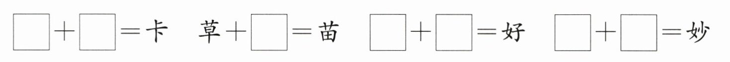 解析:这道题考查识字方法。结合儿歌内容可知,“卡”可以分为“上”和“下”,“草”和“田”可以组成“苗”,“好”可以分成“女”和“子”,“妙”可以分成“女”和“少”。