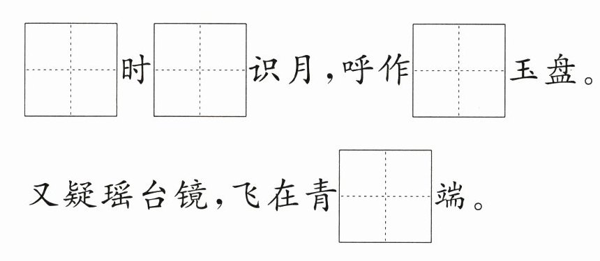 1. 小 不 白 云 解析:这道题考查对古诗的积累。根据古诗内容填空,书写的时候注意字的结构和笔顺,不要写错别字。 2. (√) ( ) 解析:这道题考查对古诗内容的理解。“又疑瑶台镜”说明此时诗人怀疑月亮是仙人的镜子,镜子是圆的,所以此刻月亮也是圆的,第一幅图正确。