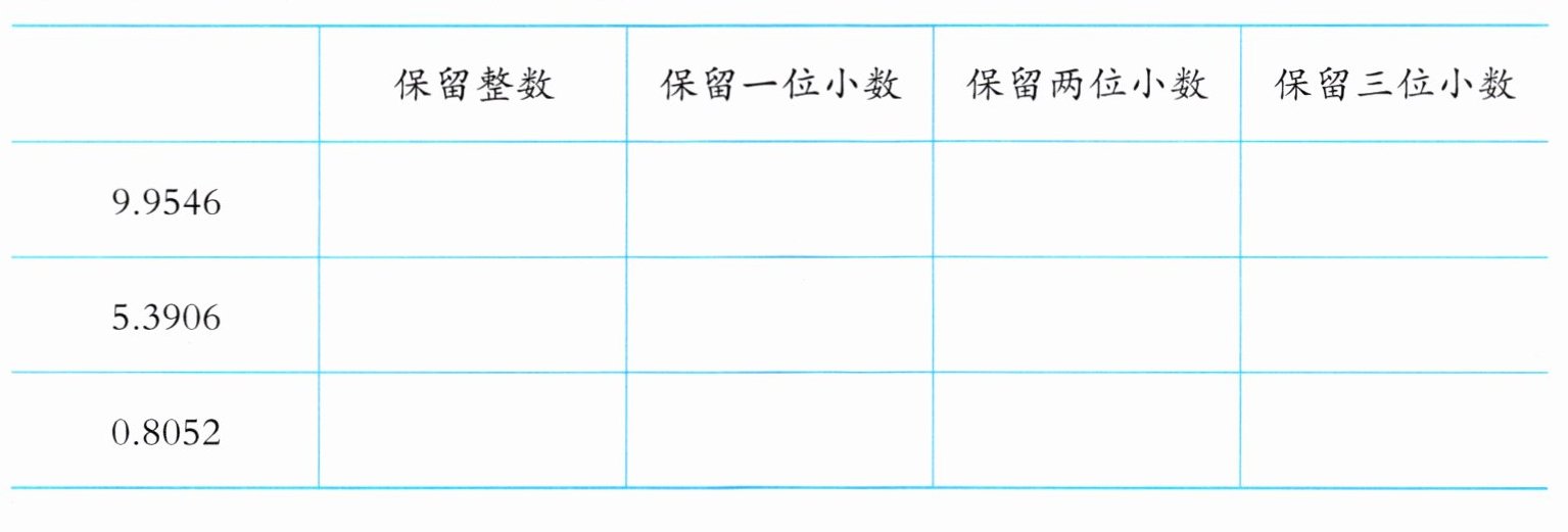 | | 保留整数 | 保留一位小数 | 保留两位小数 | 保留三位小数 |