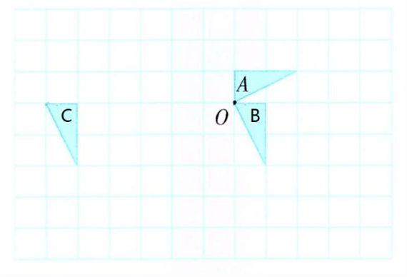 5. 画一画,将图形 A 绕点 O 沿顺时针方向旋转 $ 90^{\circ} $,得到图形 B,再向左平移 6 格得到图形 C。