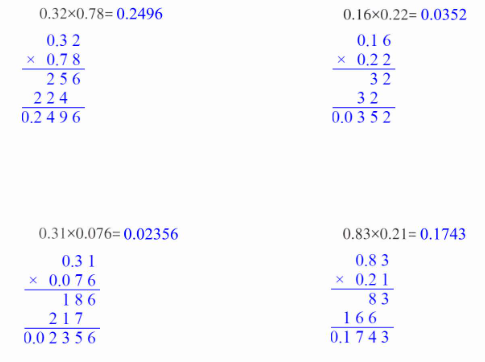 计算小数乘法时,先按照整数乘法的计算方法算出积;再看因数中一共有几位小数,就从积的右边起数出几位,点上小数点;如果积的小数位数不够,要在前面用0补足,再点小数点。