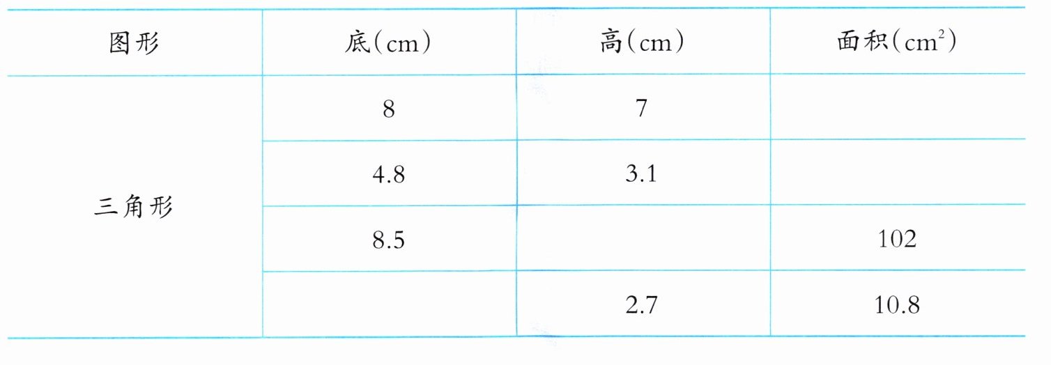 5. 下面两条虚线互相平行,你能在两条虚线之间画一个与图中三角形面积相等但形状不一样的三角形吗?