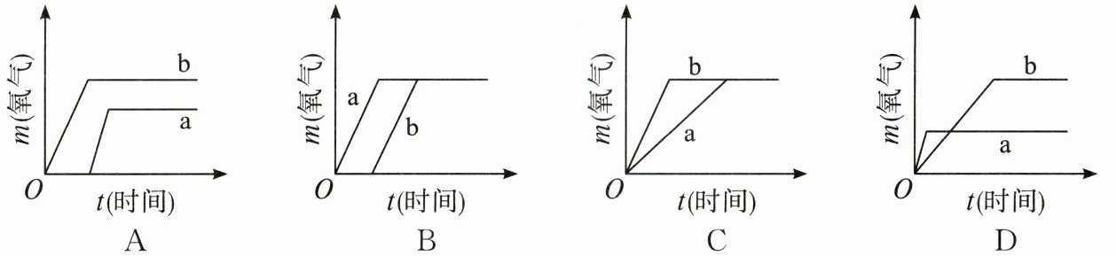 14. 分别取两份相同质量、相同浓度的过氧化氢溶液,其中一份(用a表示)直接制取氧气,在另一份(用b表示)中加入少量的二氧化锰。下列图像正确的是(