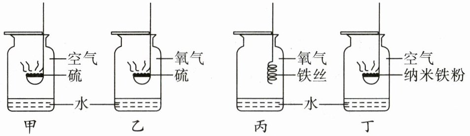 11. 如图是硫和铁在空气中和氧气中燃烧的实验。铁丝在空气中不能燃烧,但是纳米铁粉在空气中稍加热即可剧烈燃烧。下列说法正确的是(