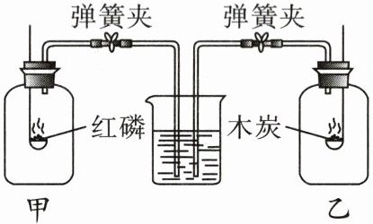 13. 如图所示,等体积的甲、乙两个集气瓶内充满空气,燃烧匙内分别盛有过量的红磷和木炭,点燃使其充分反应,冷却至室温,打开弹簧夹,出现的现象是(