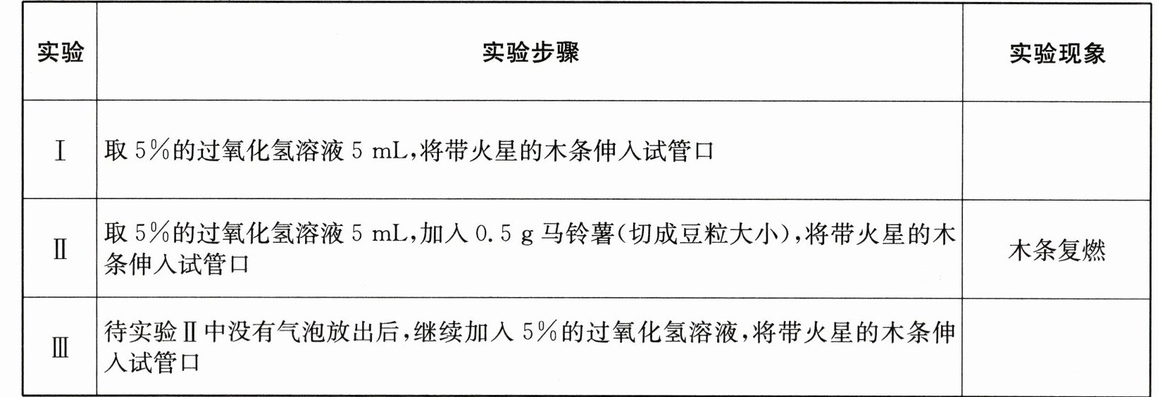 (3)常温下,过氧化氢的分解速率较小,故实验Ⅰ的现象是带火星的木条不复燃,实验Ⅲ中待实验Ⅱ中没有气泡放出后,继续加入5%的过氧化氢溶液,将带火星的木条伸入试管口,现象为带火星的木条复燃,说明化学反应前后,马铃薯的化学性质不变。