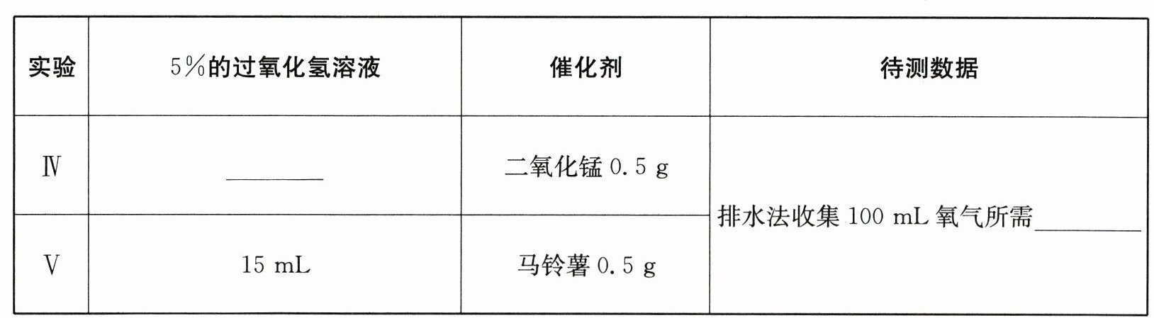 (5)控制变量实验时,除了催化剂的种类不同外,其他的条件要相同,所以实验Ⅳ过氧化氢溶液体积是15 mL,马铃薯和二氧化锰的催化效果可通过比较排水法收集100 mL氧气所需时间来判断。