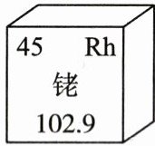 D 解析 根据元素周期表中的一格信息可知,左上角的数字表示原子序数,则铑的原子序数为45,A项正确;字母表示该元素的元素符号,则铑的元素符号为Rh,B项正确;铑字带金字旁,属于金属元素,C项正确;相对原子质量的单位为"1",而不是"g",常省略不写,D项错误。