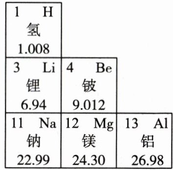 B 解析 题图中有锂、铍、钠、镁、铝五种金属元素,A项错误;由题图中铍元素的单元格信息可知,铍的相对原子质量为9.012,B项正确;氢、锂、钠三种元素位于同一族,C项错误;钠、镁、铝三种元素位于同一周期,其原子核外最外层电子数不相等,化学性质不相似,D项错误。