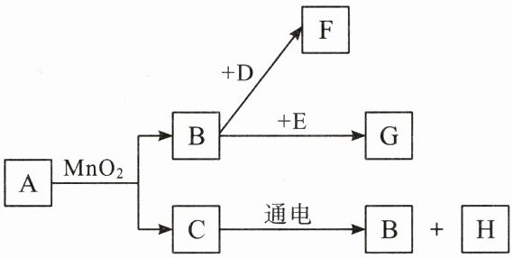 17. $A\sim G是初中化学常见的7$种物质,它们的转化关系如图。已知$A$、$C$是无色液体,$B$、$F$、$G$是无色气体,其中$F$能使澄清石灰水变浑浊,$D$是黑色固体,$E在B$中燃烧发出蓝紫色火焰且产生有刺激性气味的气体。