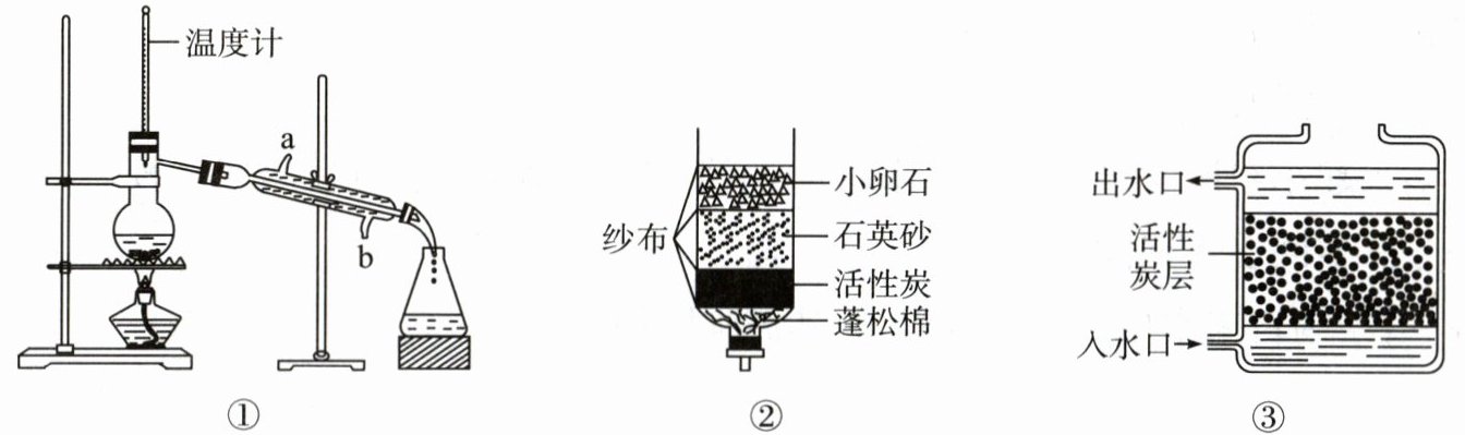 D 解析 冷凝管中的冷凝水应该从b口进,a口出,冷凝效果最佳,A项正确。②中颗粒自上而下粒径依次减小,能更好地起到净化作用,B项正确。活性炭具有吸附性,可以除去水中的色素和异味,C项正确。①②③中,①为蒸馏,净化程度最高,D项错误。