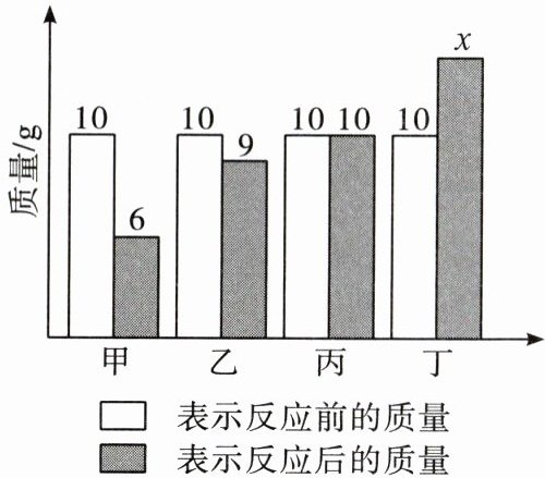 C 解析 根据质量守恒定律,x=(10+10+10+10)-(6+9+10)=15,A项正确;丙的质量在反应前后没有变化,可能为该反应的催化剂,也可能不参与反应,B项正确;甲、乙的质量减小,为反应物,丁的质量增大,为生成物,则此反应为化合反应,C项错误;反应中甲、乙的质量比为(10g - 6g):(10g - 9g)=4:1,D项正确。