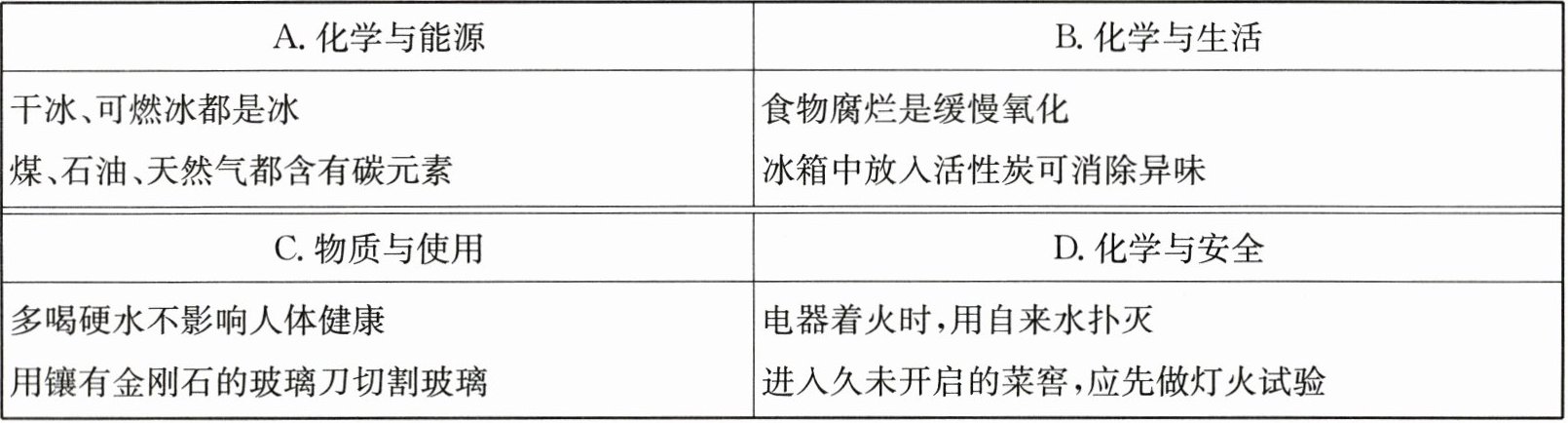 B 解析 干冰是固态的二氧化碳、可燃冰的主要成分是甲烷,都不是冰,A项错误。食物腐烂是在氧气的作用下缓慢进行的,属于缓慢氧化;活性炭具有吸附性,可消除异味,B项正确。生活中多喝硬水,人会得肾结石、尿道结石等,会影响人体健康,C项错误。电器着火时,不能用水扑灭,应该先切断电源,D项错误。