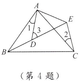 4. 如图,$ AB = AC $,$ AD = AE $,$ \angle BAC = \angle DAE $,$ \angle 1 = 25^{\circ} $,$ \angle 2 = 30^{\circ} $,连结 $ BE $,点 $ D $ 恰好在 $ BE $ 上,则 $ \angle 3 = $(