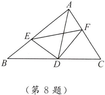 8. 如图,$ AD $ 是 $ \triangle ABC $ 的中线,点 $ E,F $ 分别在 $ AB,AC $ 上(点 $ E,F $ 不与端点重合),且 $ DE \perp DF $。则 $ BE + CF $ 与 $ EF $ 的关系是(