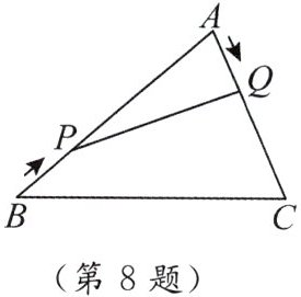 8. 如图,在 $\triangle ABC$ 中,$AB = 20cm$,$AC = 12cm$,点 $P$ 从点 $B$ 出发以 $3cm/s$ 的速度向点 $A$ 运动,点 $Q$ 同时从点 $A$ 出发以 $2cm/s$ 的速度向点 $C$ 运动,其中一个动点到达端点时,另一个动点也随之停止。当 $\triangle APQ$ 是以 $PQ$ 为底的等腰三角形时,运动的时间是