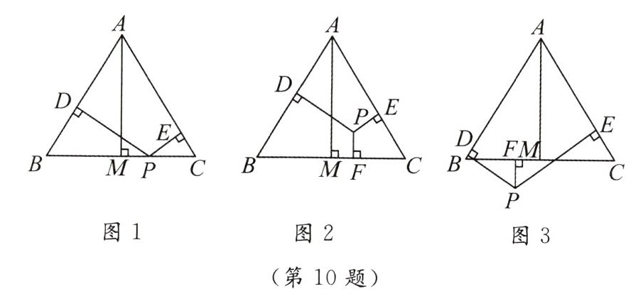 10. 已知等边三角形 $ABC$ 和点 $P$,设点 $P$ 到 $\triangle ABC$ 的三条边 $AB$,$AC$,$BC$ 的距离分别为 $h_{1}$,$h_{2}$,$h_{3}$,$\triangle ABC$ 的高线长为 $h$。