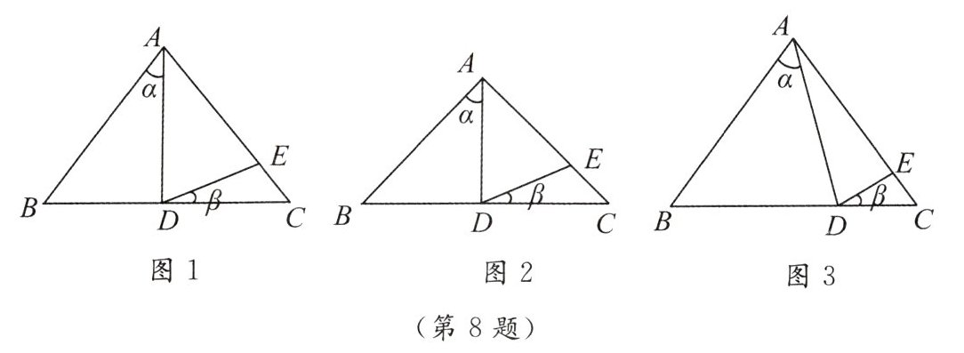 .★(3)如图3,D为BC上任意一点. 请你思考,若AD= AE,则∠α和∠β之间有什么关系?请你写出来,并说明你的理由.