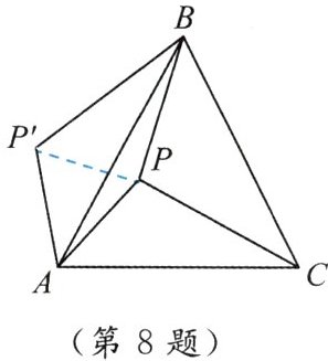 8. 如图,$P$ 是正三角形 $ABC$ 内的一点,且 $PA = 6,PB = 8,PC = 10$,若将 $\triangle PAC$ 绕点 $A$ 逆时针旋转后得到 $\triangle P'AB$。