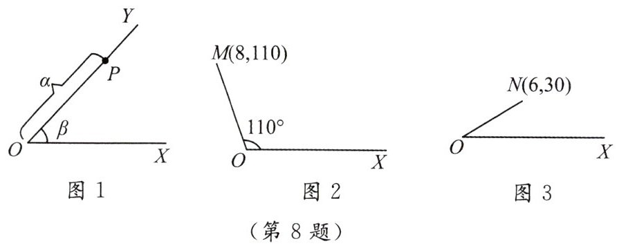8. 如图 1,将射线 $OX$ 按逆时针方向旋转 $\beta$ 角,得到射线 $OY$,如果点 $P$ 为射线 $OY$ 上的一点,且 $OP = a$,那么我们规定用 $(a,\beta)$ 表示点 $P$ 在平面内的位置,并记为 $P(a,\beta)$. 例如,图 2 中,如果 $OM = 8$,$\angle XOM = 110^{\circ}$,那么点 $M$ 在平面内的位置记为 $M(8,110)$. 根据图形,解答下列问题.