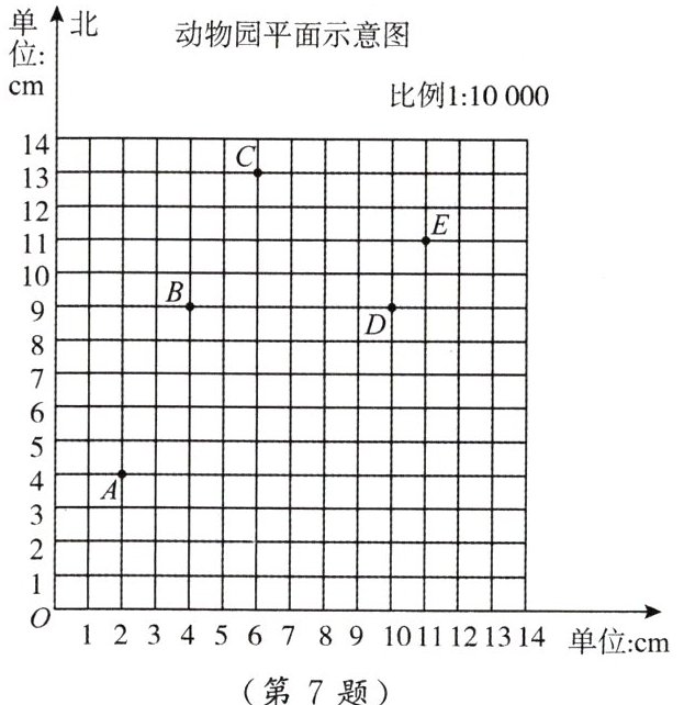7. 如图是动物园的平面示意图,$A$,$B$,$C$,$D$,$E$ 分别表示熊猫馆、水族馆、鸟类馆、猴山和河马馆. 请借助比例尺、量角器解决如下问题.