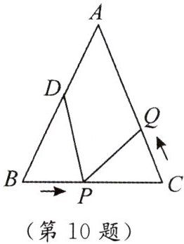 10. 如图,已知在$\triangle ABC$中,$AB= AC= 10\mathrm{cm}$,$BC= 8\mathrm{cm}$,$D为AB$的中点,点$P在线段BC上以3\mathrm{cm}/\mathrm{s}的速度由点B向点C$运动,同时,点$Q在线段CA上由点C向点A以a\mathrm{cm}/\mathrm{s}$的速度运动,设运动的时间为$t\mathrm{s}$.