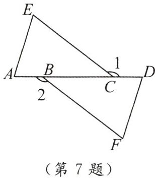 7. 如图,$\triangle ACE≌\triangle DBF$,给出下列结论:①$AC= DB$;②$AB= DC$;③$\angle 1= \angle 2$;④$AE// DF$;⑤$S_{\triangle ACE}= S_{\triangle DFB}$;⑥$BC= AE$;⑦$BF// EC$.其中正确的有(