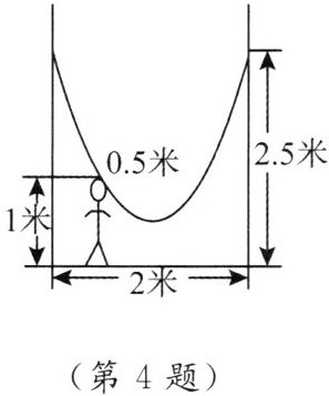 4. 如图,小明的父亲在相距$2$米的两棵树间拴了一根绳子,给小明做了一个简易的秋千.拴绳子的地方距地面高度是$2.5$米,绳子自然下垂呈抛物线状,身高$1米的小明距较近的那棵树0.5$米时,头部刚好接触到绳子,则绳子的最低点距地面的距离为