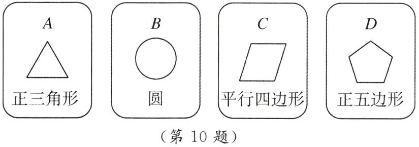 10. 有4张背面相同的纸牌A,B,C,D,其正面分别画有4个不同的几何图形(如图),小华将这4张纸牌背面朝上洗匀后摸出一张,放回洗匀后再摸出一张,用树状图(或列表法)表示两次摸牌所有可能出现的结果(纸牌可用A,B,C,D表示)。