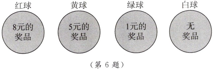 6. 校门口经常有小贩搞摸奖活动.某小贩在一只黑色的口袋里装有只有颜色不同的 50 只小球,其中红球 1 只,黄球 2 只,绿球 10 只,其余为白球.搅拌均匀后,每 2 元摸 1 只.如图,奖品的情况标注在球上.