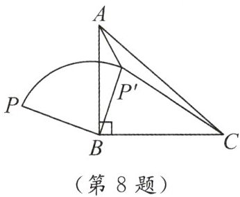8. 如图,$ P $ 是等腰直角 $ \triangle ABC $ 外一点,把 $ BP $ 绕点 $ B $ 顺时针旋转 $ 90^{\circ} $ 到 $ BP' $,已知 $ \angle AP'B = 135^{\circ} $,$ P'A : P'C = 1 : 3 $,则 $ P'A : PB = $(