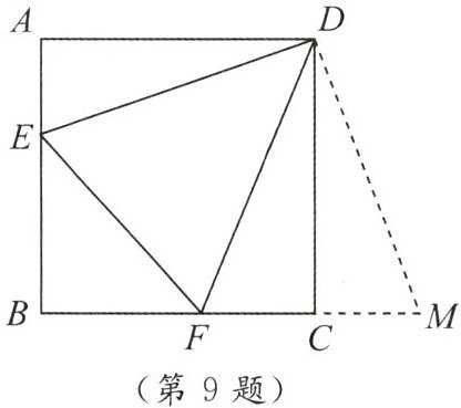 9. 正方形 $ ABCD $ 的边长为 $ 3 $,$ E $,$ F $ 分别是 $ AB $,$ BC $ 边上的点,且 $ \angle EDF = 45^{\circ} $.将 $ \triangle DAE $ 绕点 $ D $ 逆时针旋转 $ 90^{\circ} $,得到 $ \triangle DCM $.