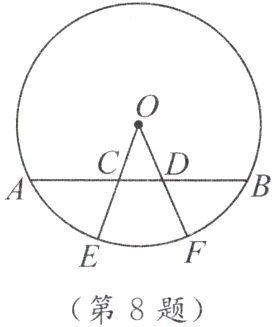 8. 如图,已知$\odot O的弦AB$,$E$,$F是\overset{\frown}{AB}$上两点,且$\overset{\frown}{AE}= \overset{\frown}{BF}$,$OE$,$OF分别交AB于点C$,$D$。求证:$AC = BD$。