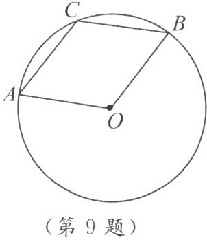 ▲9. 如图,$A$,$B$,$C是\odot O$上三点,$\angle AOB = 120^{\circ}$,$C是\overset{\frown}{AB}$的中点,试判断四边形$OACB$形状,并说明理由。