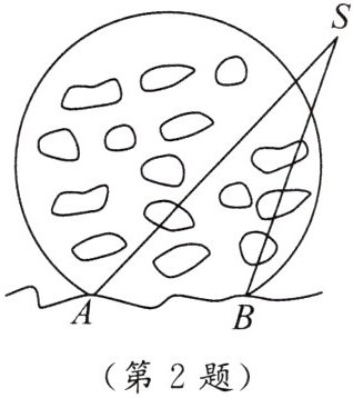 2. 如图,两灯塔$A$,$B$间的距离恰好为暗礁所在的圆的半径,要使船$S$不驶入暗礁区,则航行中应保持$\angle S$(