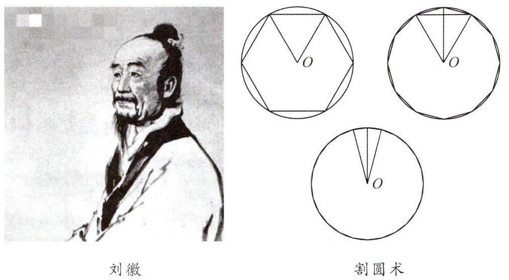 我国魏晋时期的数学家刘徽在《九章算术注》中提出“割圆术”,以“圆内接正多边形的面积”,来无限逼近“圆面积”。刘徽形容他的“割圆术”说:割之弥细,所失弥少,割之又割,以至于不可割,则与圆合体,而无所失矣。即通过圆内接正多边形细割圆,并使正多边形面积无限接近圆面积,根据圆周率$=\frac{正n边形面积}{半径平方}$,进而求得较为精准的圆周率。刘徽从圆内接正六边形开始,每次把边数加倍,直至圆内接正九十六边形,算得圆周率为$3.14$。