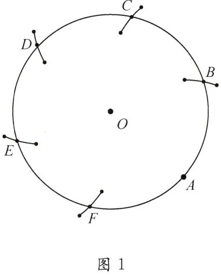 ①在$\odot O上任取一点A$,从点$A$开始,以$\odot O$的半径为半径,在上依次截取点$B$,$C$,$D$,$E$,$F$;