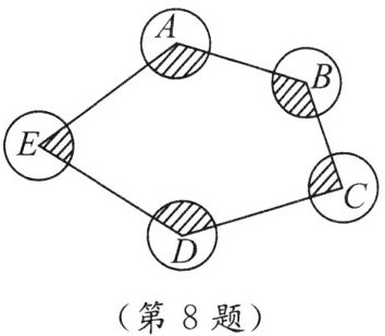 8. 如图,$\odot A$,$\odot B$,$\odot C$,$\odot D$,$\odot E半径都是1$,顺次连结五个圆心得到五边形$ABCDE$,则图中五个扇形(阴影部分)的面积之和是