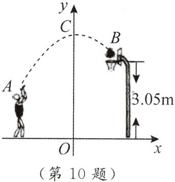 ▲10. 如图,一位运动员在离篮下水平距离 $ 4m $ 处起跳投篮,球运行的路线是抛物线(顶点 $ C $ 在 $ y $ 轴上),当球运行的水平距离是 $ 2.5m $ 时,球达到最大高度 $ 3.5m $. 已知篮筐中心到地面的距离为 $ 3.05m $,问球出手时离地面多少米才能投中篮筐.