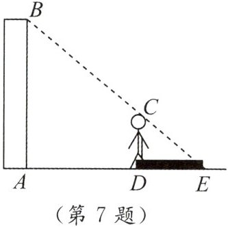 ▲7. 如图,小明从路灯下A处起步向前走了5米,发现自己在地面上的影子长DE是2米,如果小明的身高为1.6米,那么路灯离地面的高度AB为多少米?