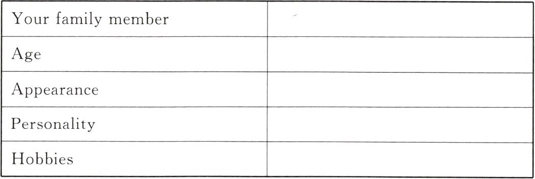 选择你的一位家庭成员,并展示他/她的照片。根据实际情况完成以下表格,并写一篇短文介绍她/他,不少于 50 词。