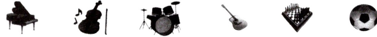1. piano 2. violin 3. drums 4. guitar 5. chess 6. football